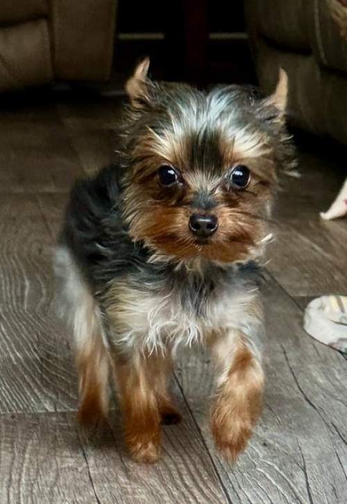 She would do great in a home with other dogs her size, but definitely NO CATS! She is quite the hunter outside chasing birds and squirrels and even stray cats if they happen to get into the yard. She is submissive, but don’t mistake that for a pushover. She is quite the mom when she needs to put another dog in line for something, but she doesn’t start anything. Even though she isn’t your typical looking yorkie, with her longer legs and her full tail, Amber is a very beautiful girl. She has the most angelic face and is just the sweetest baby. She is such a good girl and will use the pee pads when she needs to, but will also do her business on her many trips outside.