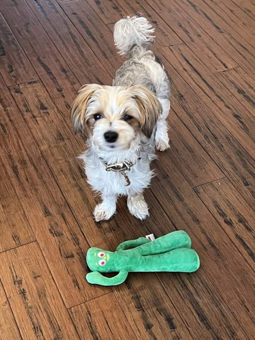 Looking for a new dog that is past the destructive phase? Keep on looking! It’s like having a toddler in the house. If there is any paper on the counter where he can reach it or if it falls to the floor, he will quickly run under the bed with it to make confetti. He is food motivated, so you can divert his attention to pick up the pieces.