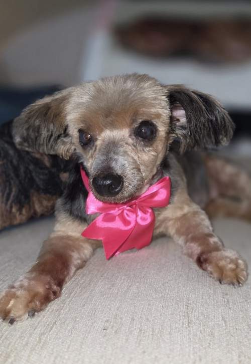 1/9/26 - Rubee was previously being fostered in San Antonio, Texas, but she and the other female yorkie in the home weren't getting along. We now know that Rubee must go to a home without a female dog. She seems to do fine with the males. Guess she doesn't like competing for the Queen title. She is now in another YHR foster home in Covington, Louisiana. She just arrived today and is settling in nicely.